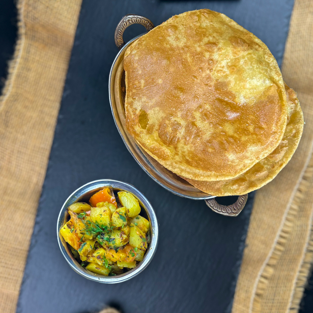Fluffy puris paired with a mildly spiced, flavorful potato curry. A comforting and filling dish that’s perfect for breakfast or lunch.