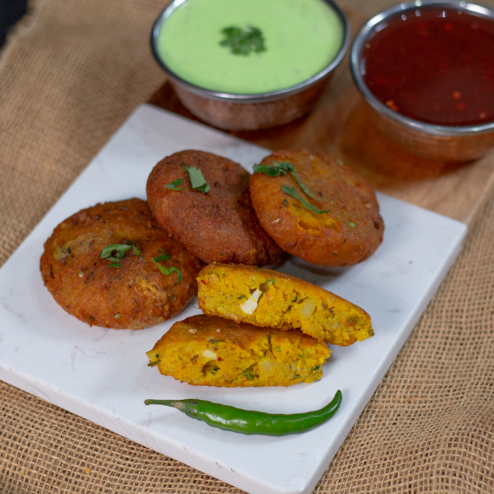 Golden, shallow-fried potato patties seasoned with spices and herbs. Crisp on the outside and soft inside, they are mildly spiced and pair well with chutneys or as part of a chaat dish.